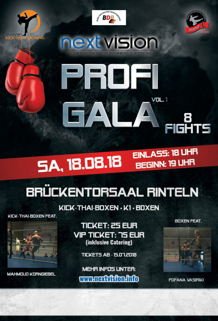 Wir präsentieren Ihnen die „Next Vision Profi Gala“ Vol. 1 ? am 18.08. im Brückentorsaal Rinteln. ? In Zusammenarbeit mit dem Bund Deutscher Berufsboxer (BDB) und dem Budox Verband (BOE) laden wir Sie herzlich zu einer spannenden Abendveranstaltung ? in der Weserstadt ein. Es erwarten Sie hochkarätige Kämpfe ? im Kick-Thai-Boxen, K1 und Boxen mit außergewöhnlichen Talenten aus unserer Region – seien Sie für einen Abend unser Gast. ??